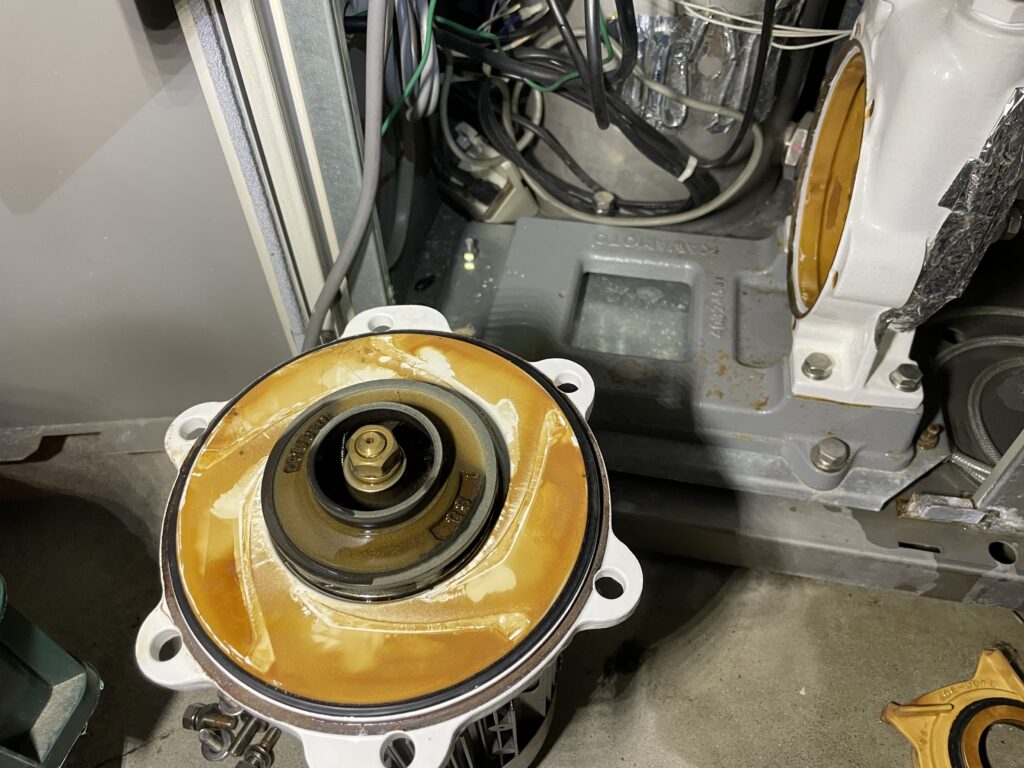 漏水は、高速で回るモーターと羽根車を仕切っている特殊構造のパッキンのようなものの劣化で起こっていました。